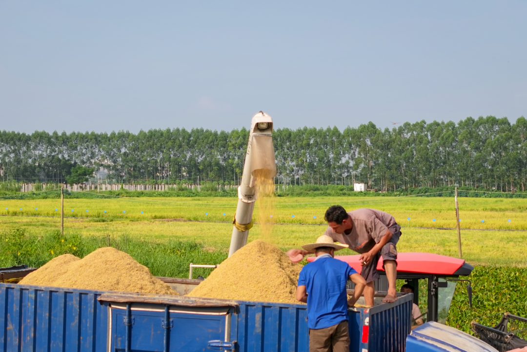 饱满的谷粒从出粮口倾泻而下,
